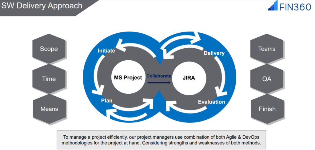 We implement an iterative and incremental approach to software development that emphasizes collaboration, customer involvement, and the ability to respond to change. Agile delivery and Devops are the approaches followed for successful delivery of software.